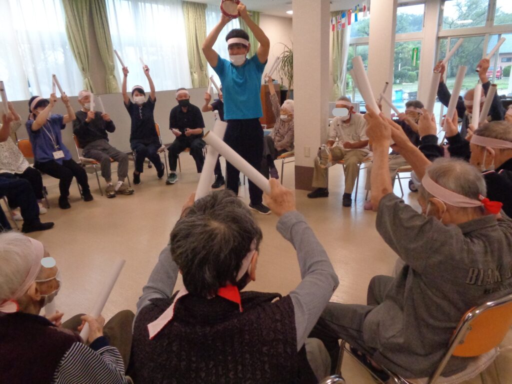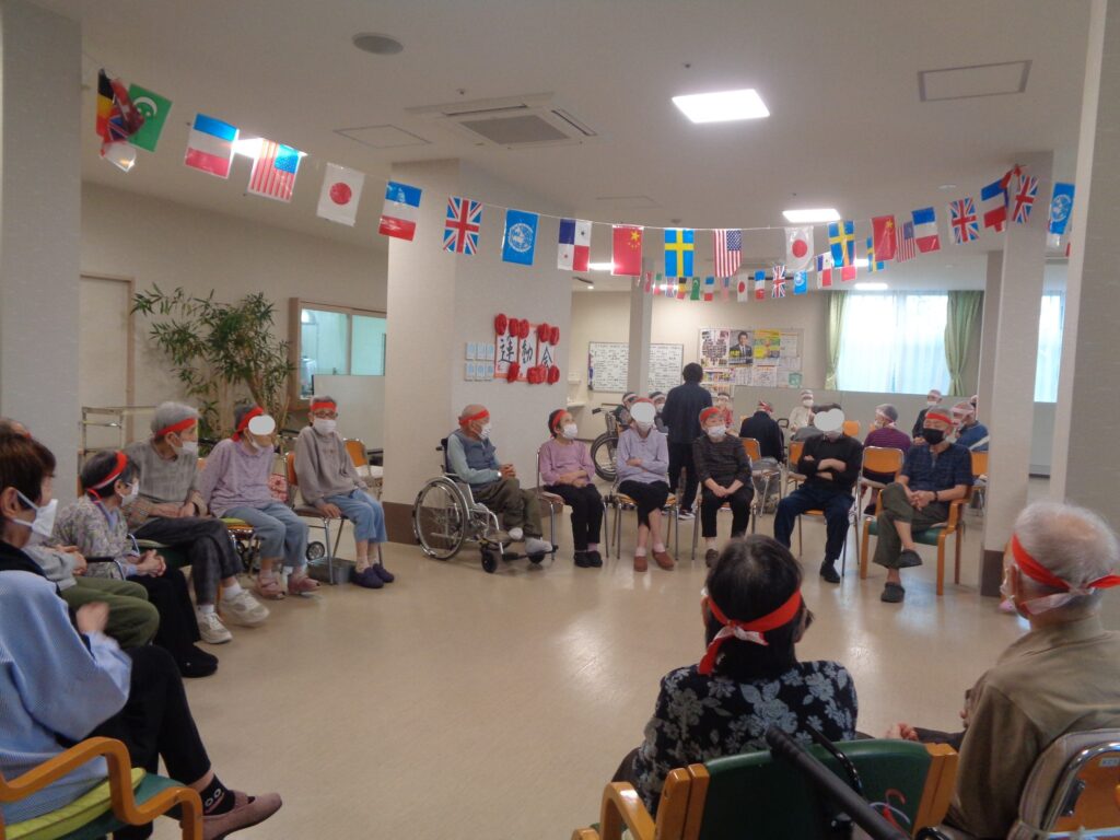 万国旗で飾りつけし、紅白のハチマキを締め、運動会ムードも高まっていました。