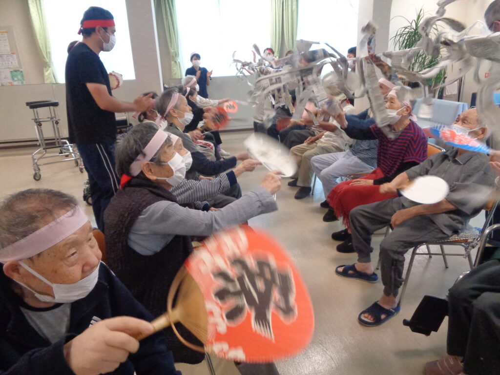 うちわであおいで、新聞を落とすタイムを競う競技もしました。